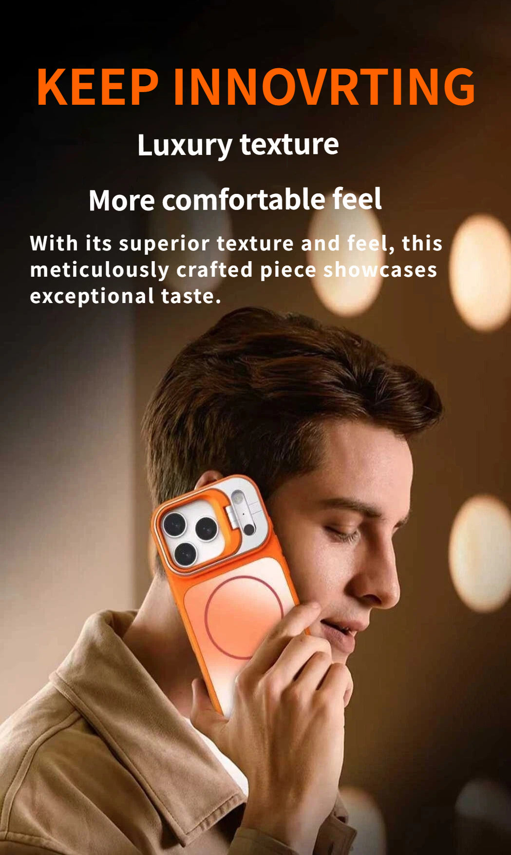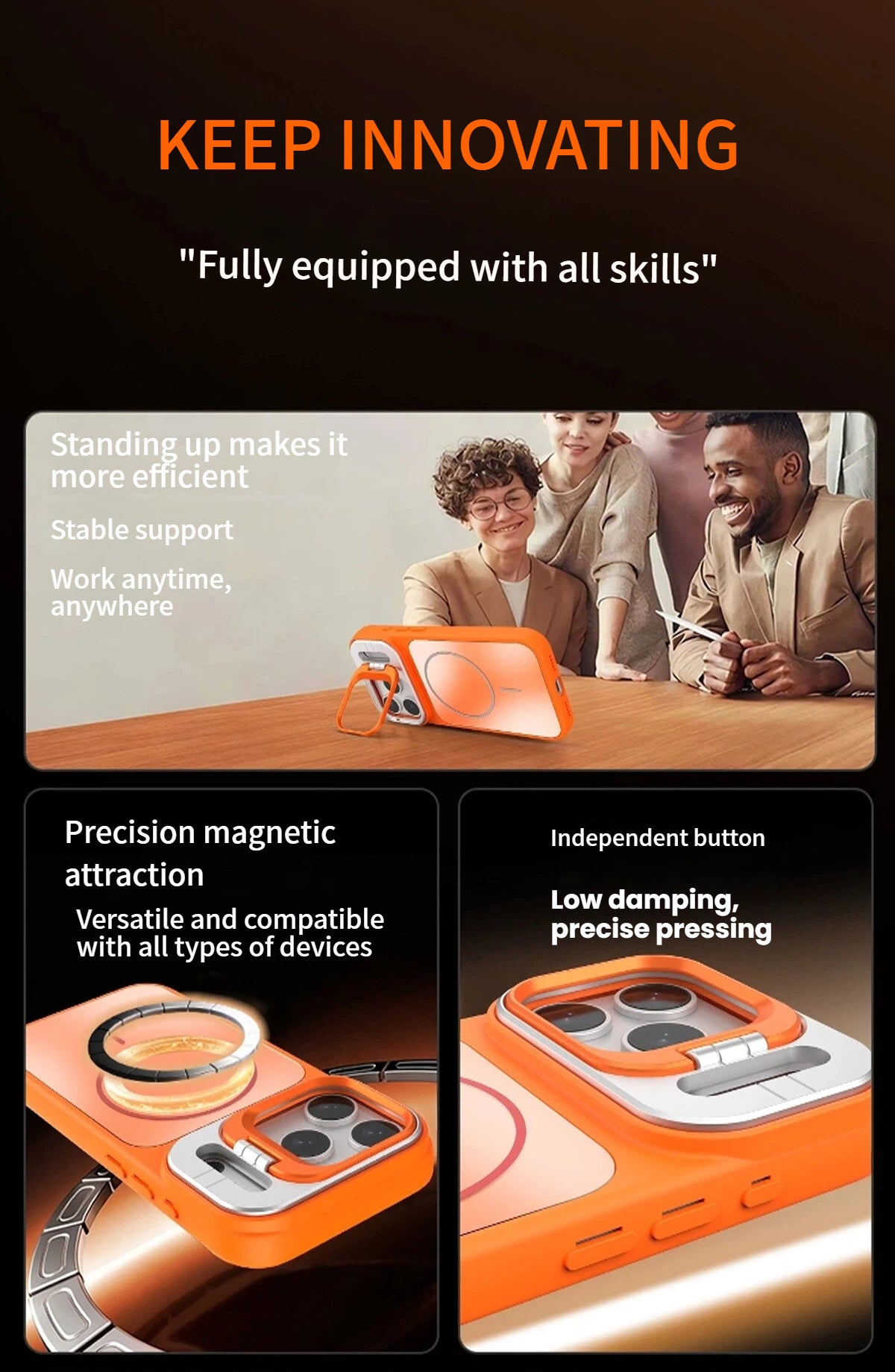 A full-cover case designed for ultimate functionality — complete camera protection, MagSafe compatibility, and a foldable lens stand that transforms how you use your phone.