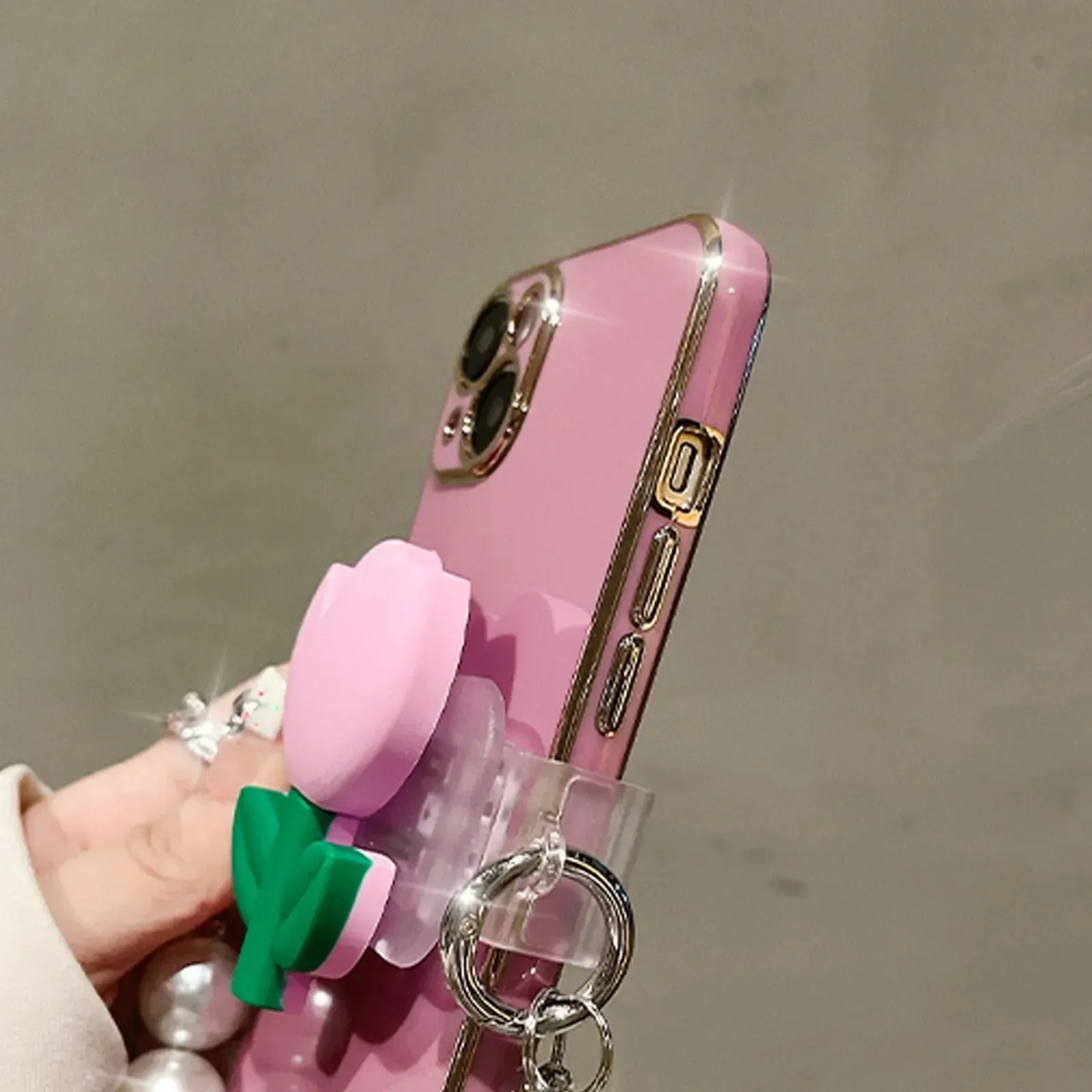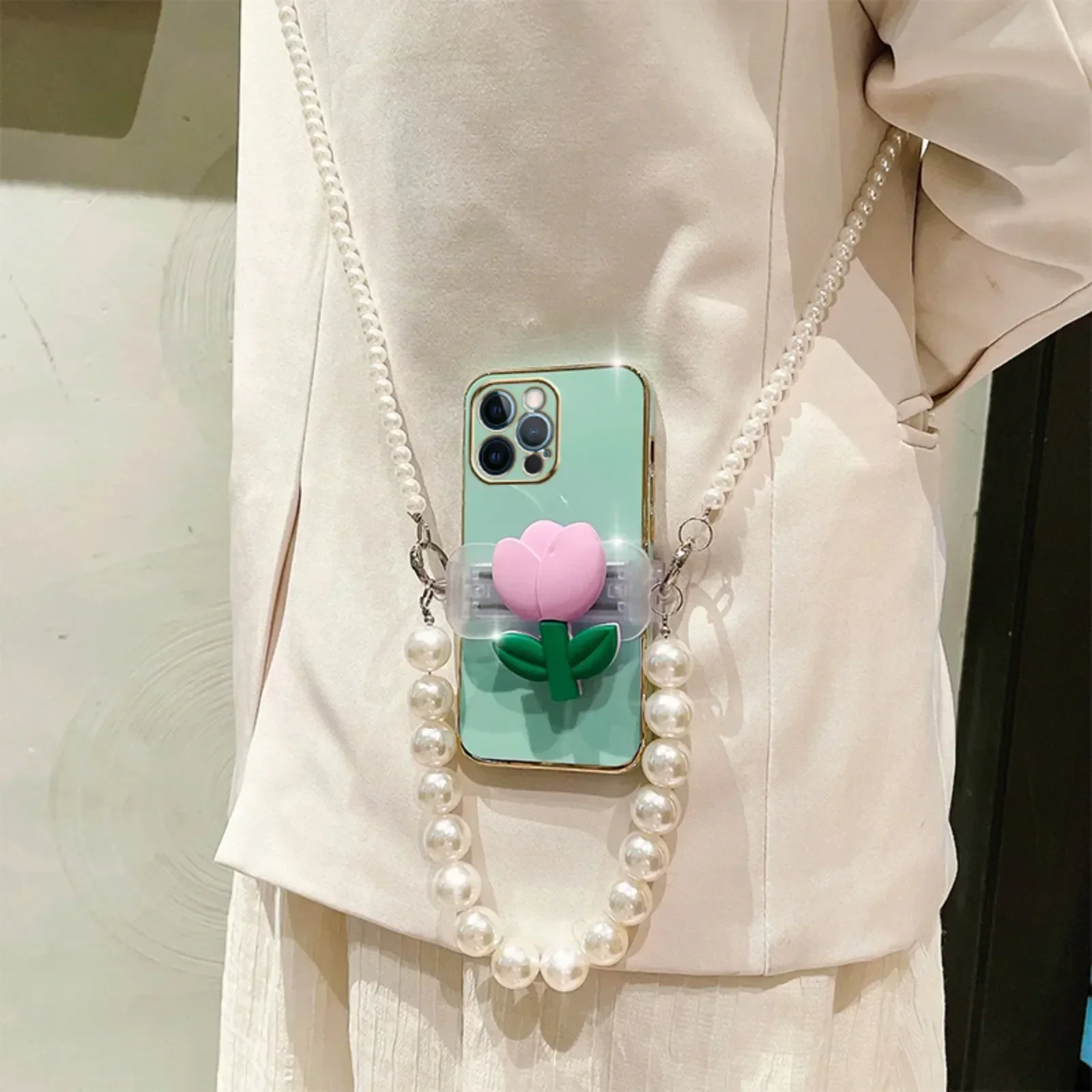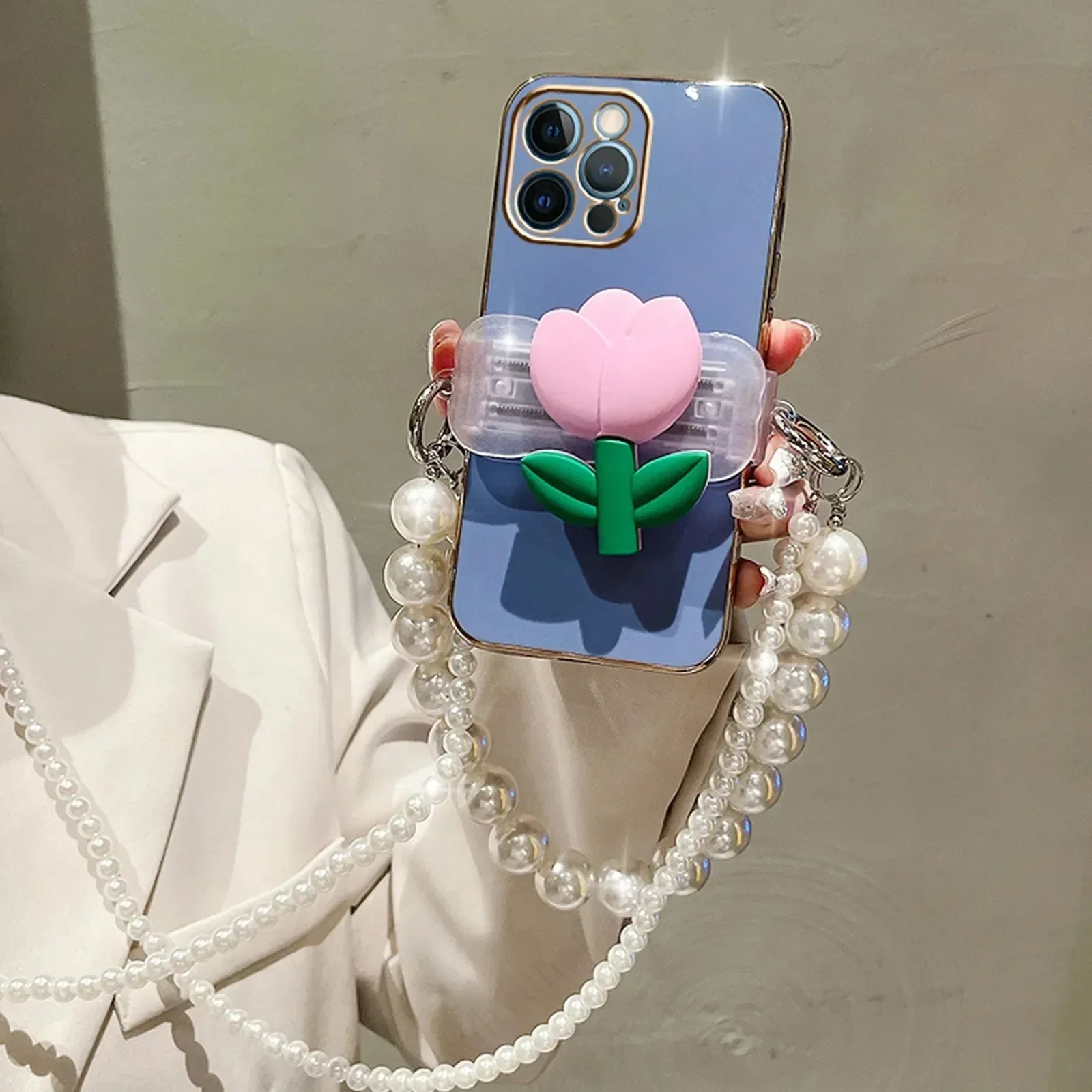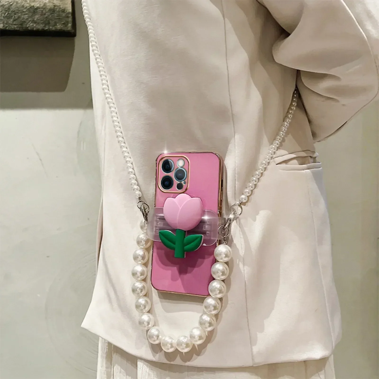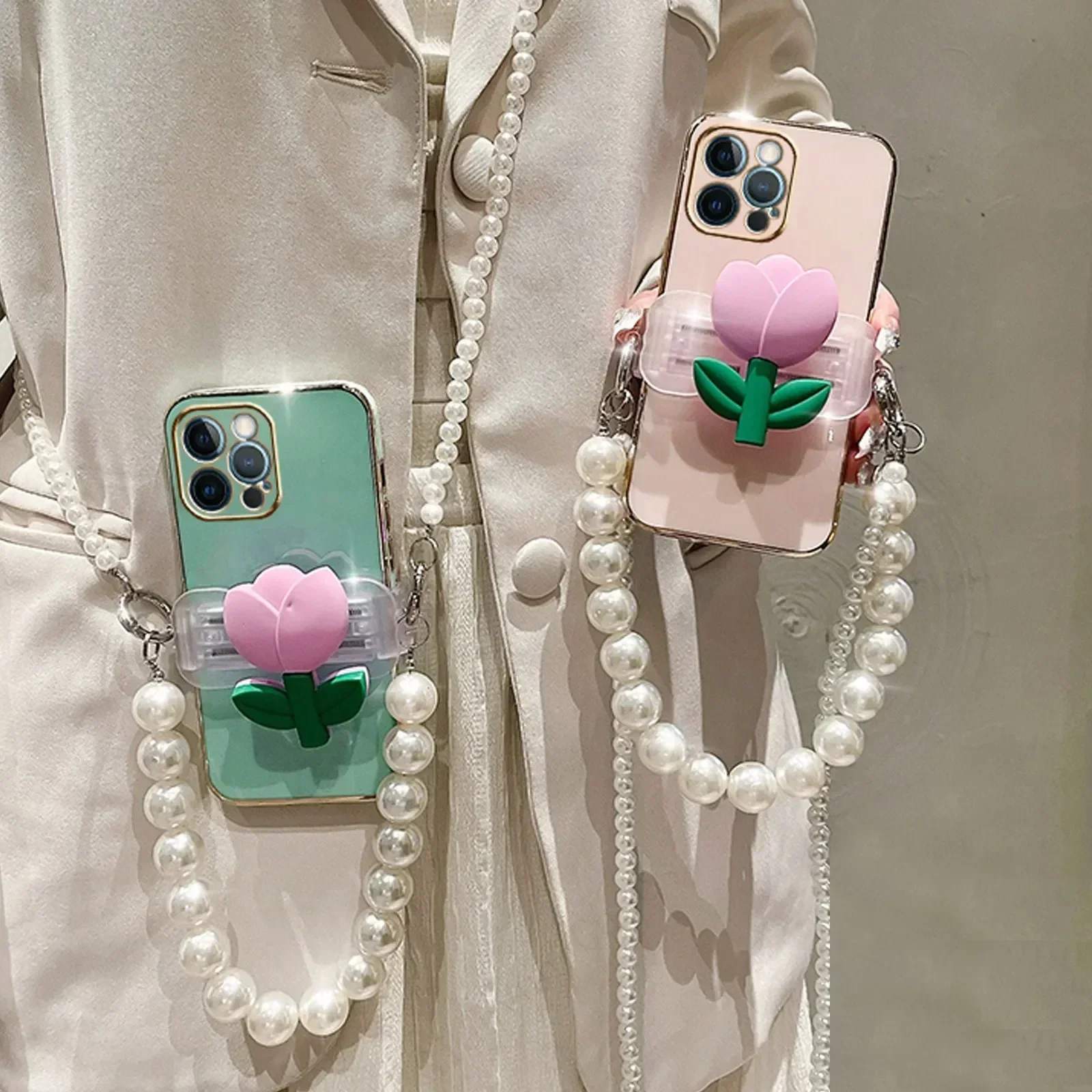3D Tulip Clip Pearl Strap Plating Case For iPhone